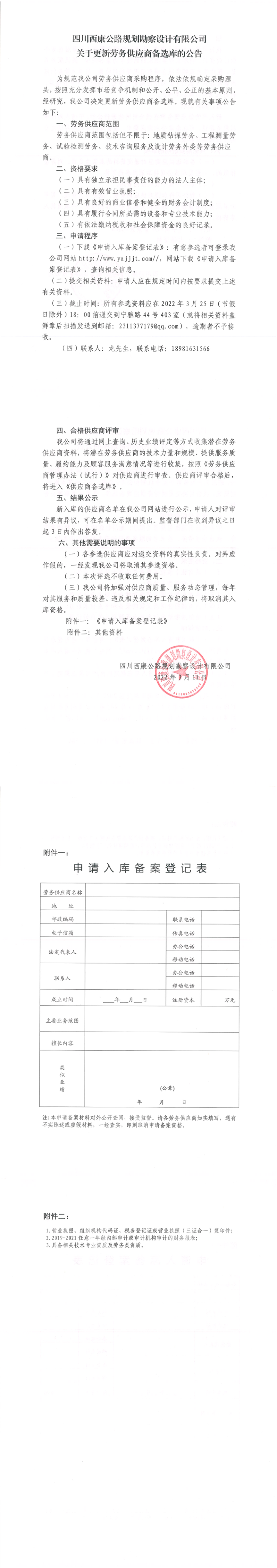 四川西康公路規(guī)劃勘察設(shè)計有限公司關(guān)于更新勞務(wù)供應(yīng)商備選庫的公告