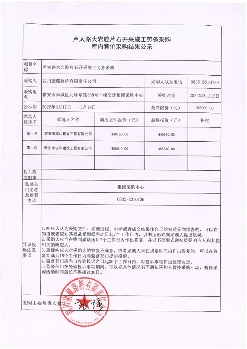 四川康藏路橋有限責(zé)任公司蘆太路大巖腔片石開采施工勞務(wù)采購(gòu)庫內(nèi)競(jìng)價(jià)采購(gòu)結(jié)果公示