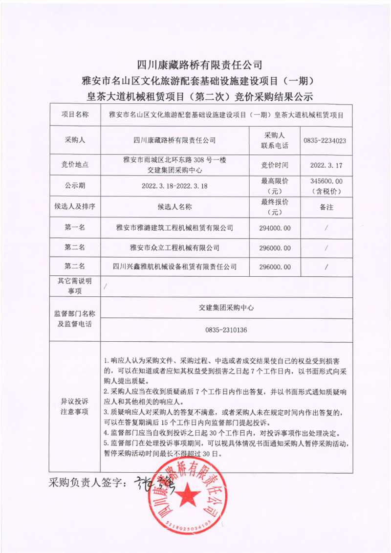 四川康藏路橋有限責(zé)任公司雅安市名山區(qū)文化旅游配套基礎(chǔ)設(shè)施建設(shè)項目(一期)皇茶大道機械租賃項目(第二次)競價采購結(jié)果公示