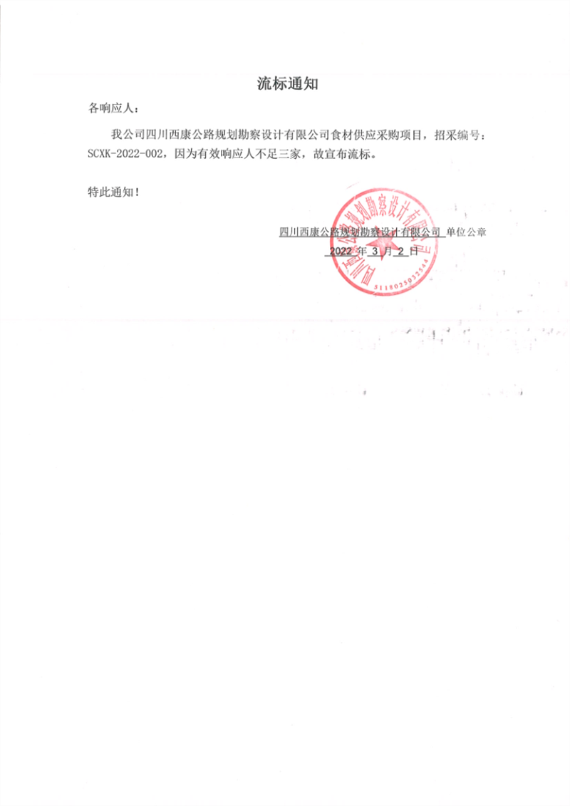 四川西康公路規(guī)劃勘察設(shè)計(jì)有限公司食材供應(yīng)采購(gòu)項(xiàng)目流標(biāo)通知