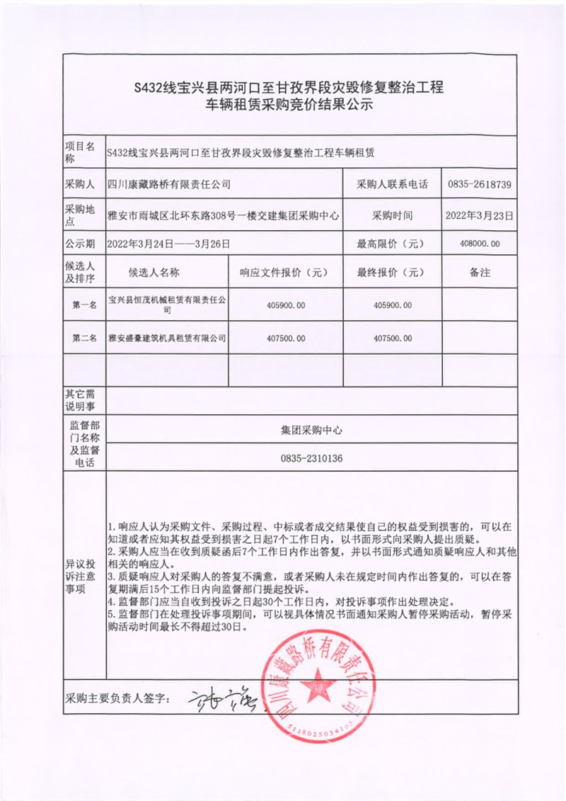 四川康藏路橋有限責任公司S432線寶興縣兩河口至甘孜界段災(zāi)毀修復(fù)整治工程車輛租賃采購競價結(jié)果公示