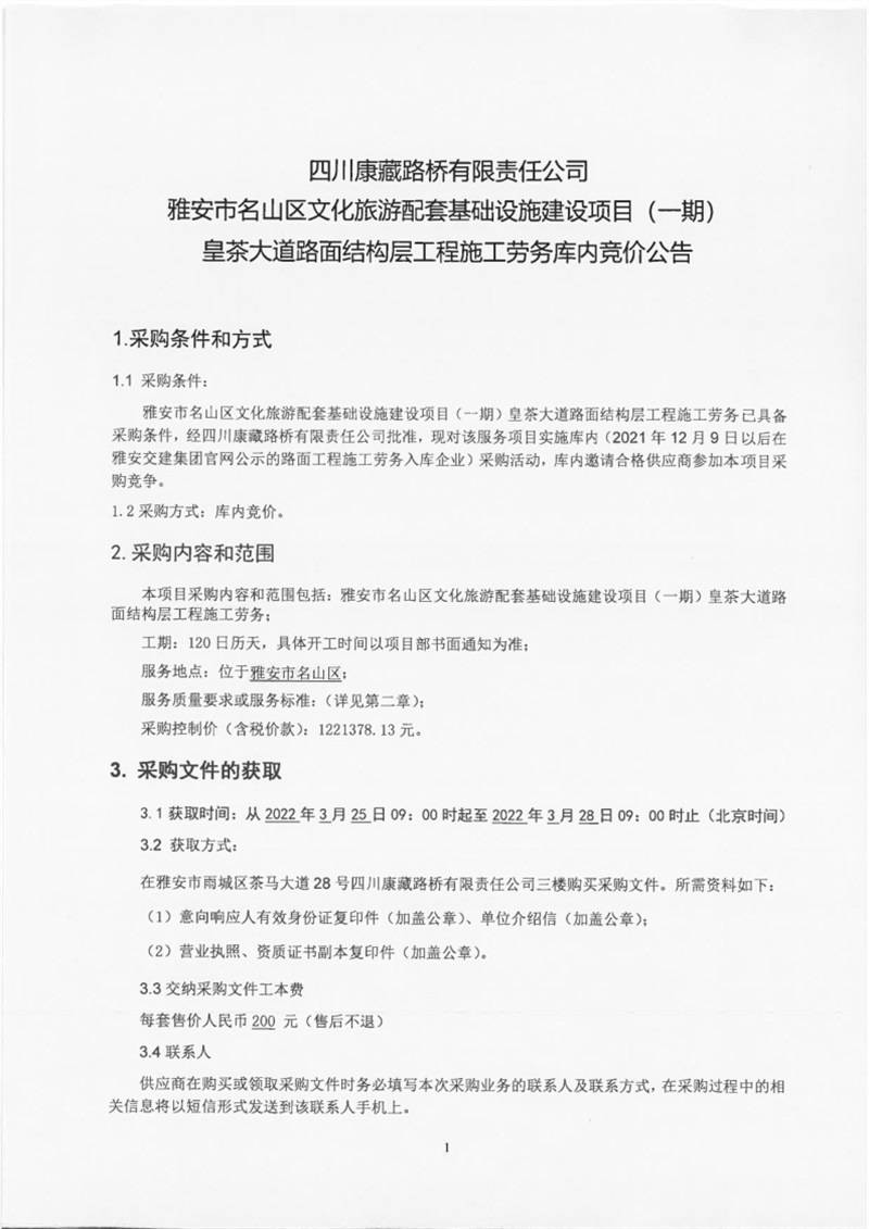 四川康藏路橋有限責(zé)任公司雅安市名山區(qū)文化旅游配套基礎(chǔ)設(shè)施建設(shè)項目(一期)皇茶大道路面結(jié)構(gòu)層工程施工勞務(wù)庫內(nèi)競價公告