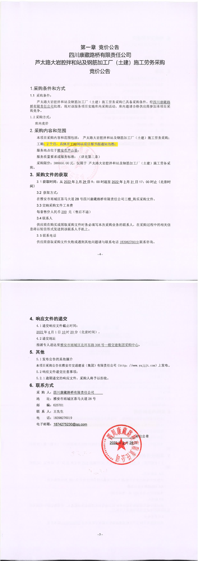 四川康藏路橋有限責(zé)任公司蘆太路大巖腔拌和站及鋼筋加工廠(chǎng)(土建)施工勞務(wù)采購(gòu)競(jìng)價(jià)公告