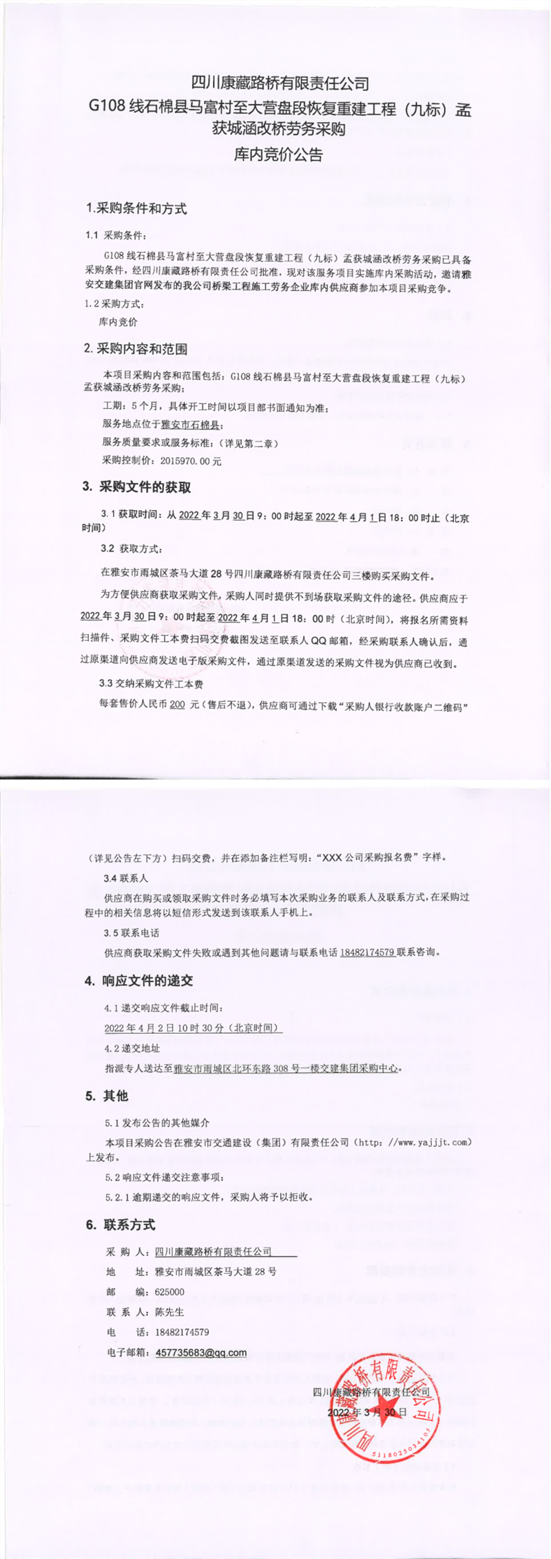 四川康藏路橋有限責(zé)任公司G108線石棉縣馬富村至大營盤段恢復(fù)重建工程(九標(biāo))孟獲城涵改橋勞務(wù)采購庫內(nèi)競(jìng)價(jià)公告