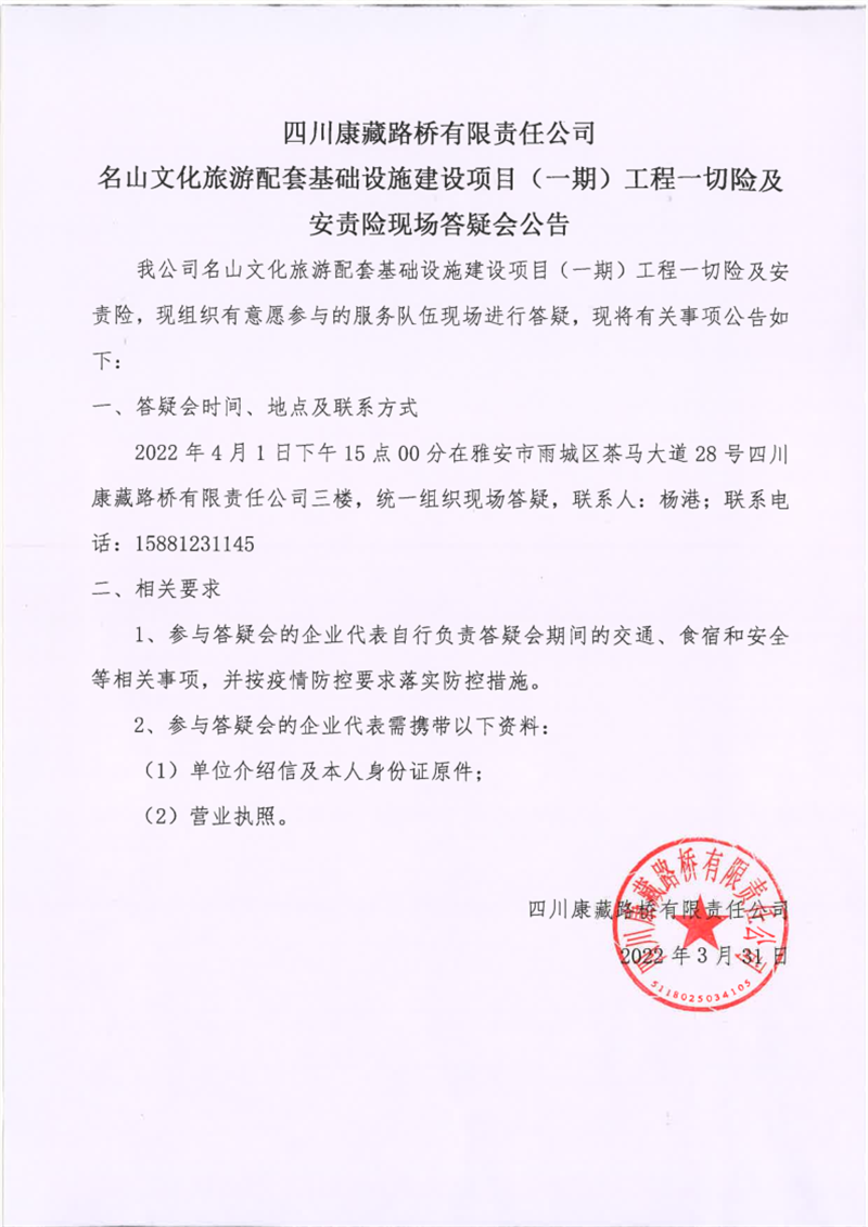 四川康藏路橋有限責(zé)任公司名山文化旅游配套基礎(chǔ)設(shè)施建設(shè)項目(一期)工程一切險及安責(zé)險現(xiàn)場答疑會公告