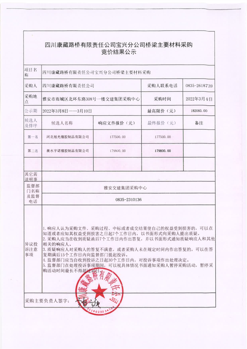 四川康藏路橋有限責(zé)任公司寶興分公司橋梁主要材料采購競價(jià)結(jié)果公示