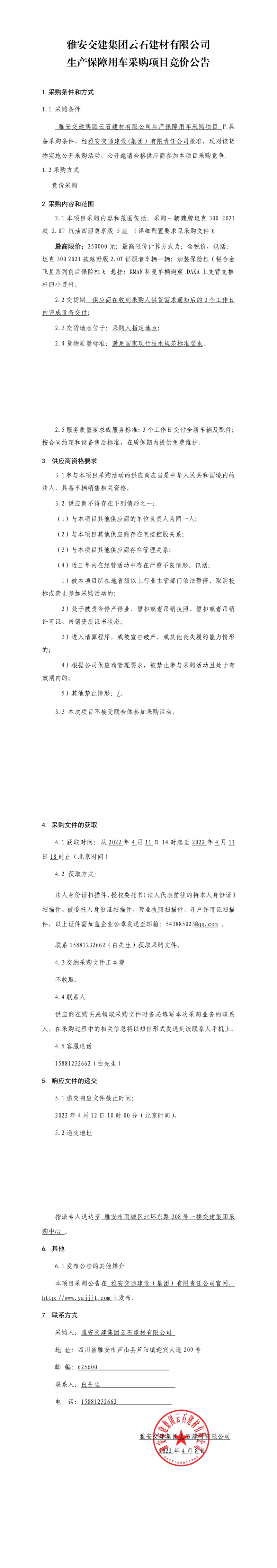 雅安交建集團云石建材有限公司生產(chǎn)保障用車采購項目競價公告