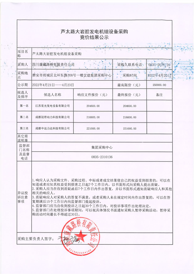 四川康藏路橋有限責(zé)任公司蘆太路大巖腔發(fā)電機(jī)組設(shè)備采購競價結(jié)果公示