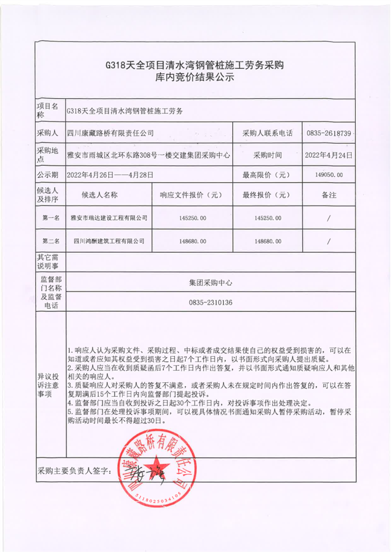 四川康藏路橋有限責任公司G318天全項目清水灣鋼管樁施工勞務(wù)采購庫內(nèi)競價結(jié)果公示