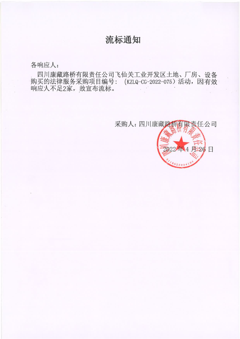 四川康藏路橋有限責任公司飛仙關(guān)工業(yè)開發(fā)區(qū)土地、廠房、設(shè)備購買的法律服務(wù)采購項目流標通知