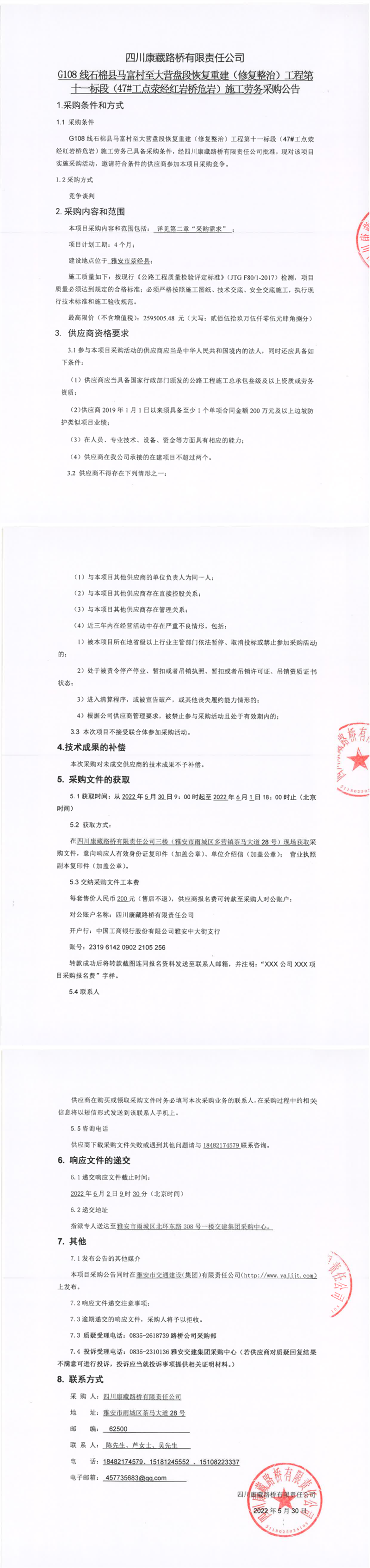 四川康藏路橋有限責任公司G108線石棉縣馬富村至大營盤段恢復重建(修復整治)工程第十一標段(47#工點滎經(jīng)紅巖橋危巖)施工勞務采購公告