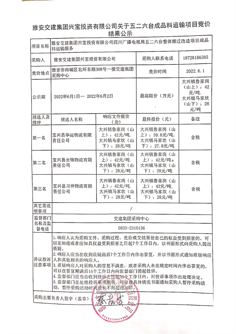 雅安交建集團(tuán)興寶投資有限公司關(guān)于五二六臺成品料運(yùn)輸項(xiàng)目競價結(jié)果公示