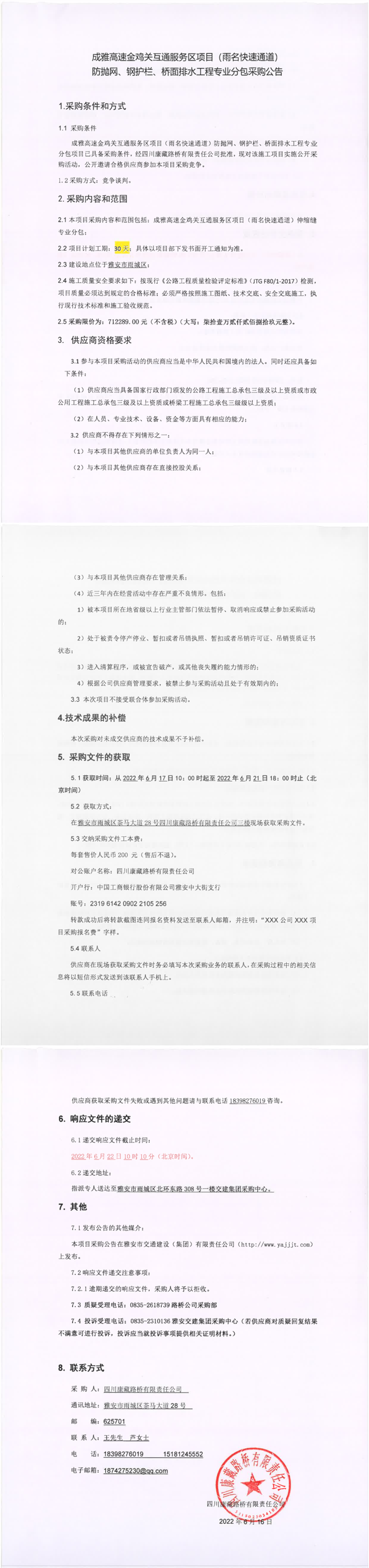 四川康藏路橋有限責任公司成雅高速金雞關(guān)互通服務區(qū)項目(雨名快速通道)防拋網(wǎng)、鋼護欄、橋面排水工程專業(yè)分包采購公告