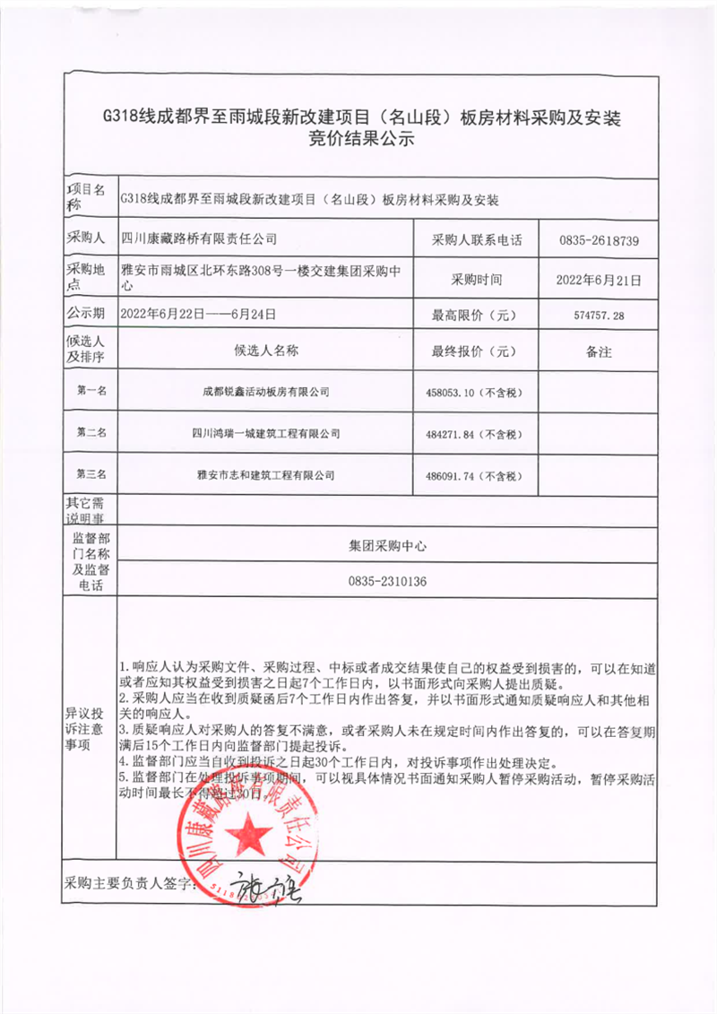 四川康藏路橋有限責(zé)任公司G318線成都界至雨城段新改建項目(名山段)板房材料采購及安裝競價結(jié)果公示