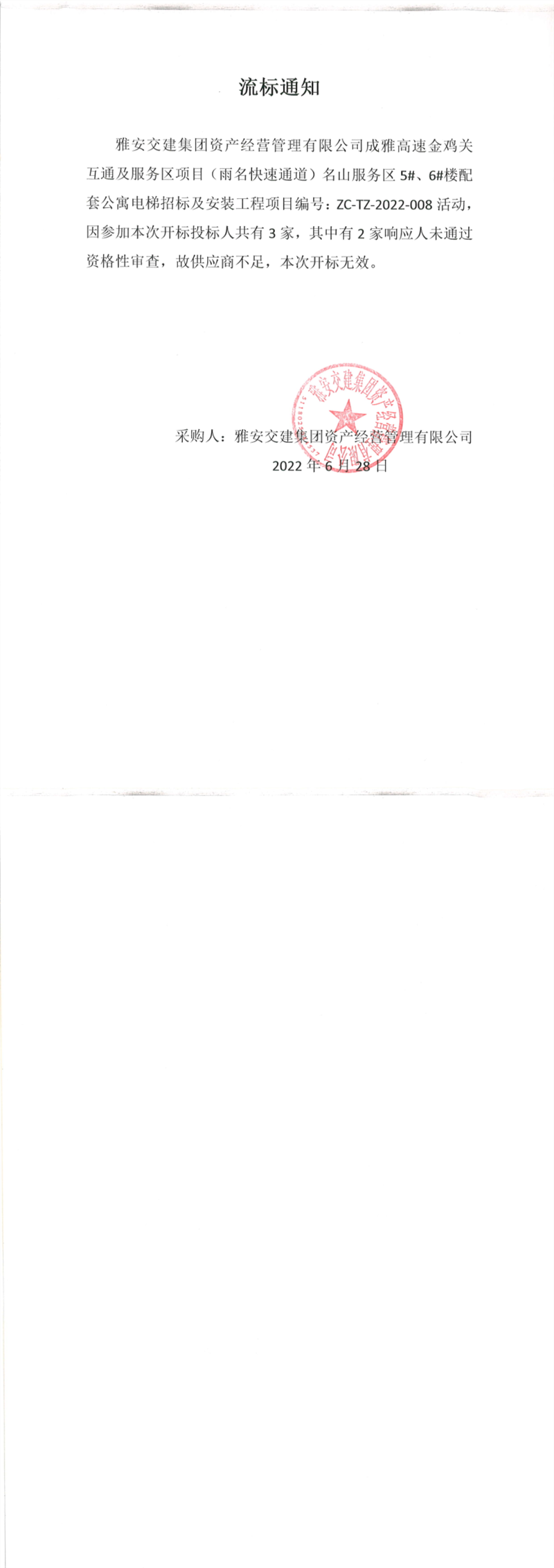 雅安交建集團資產(chǎn)經(jīng)營管理有限公司成雅高速金雞關互通及服務區(qū)(雨名快速通道)名山服務區(qū)5#、6#樓配套公寓電梯招標及安裝工程項目流標通知