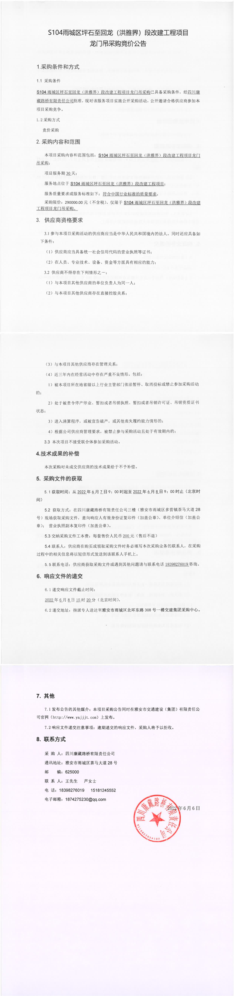 四川康藏路橋有限責(zé)任公司S104雨城區(qū)坪石至回龍(洪雅界)段改建工程項(xiàng)目龍門吊采購(gòu)競(jìng)價(jià)公告