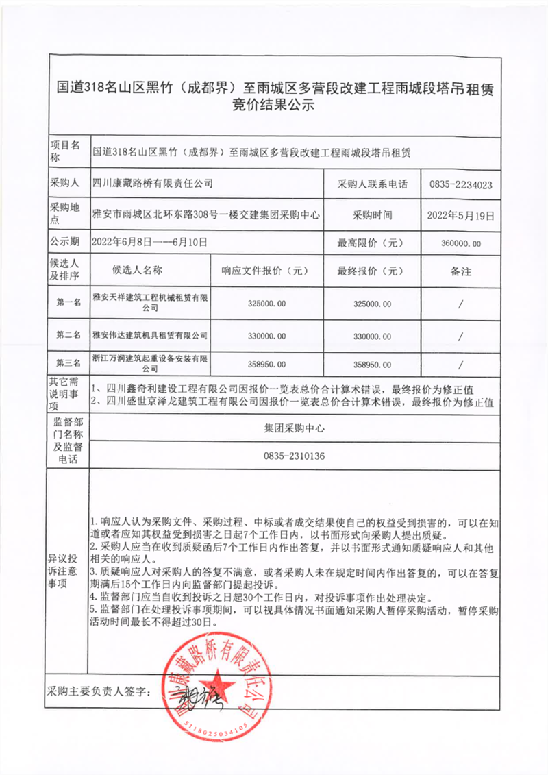 四川康藏路橋有限責(zé)任公司國道318名山區(qū)黑竹(成都界)至雨城區(qū)多營段改建工程雨城段塔吊租賃競價結(jié)果公示