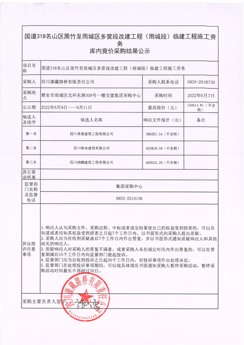 四川康藏路橋有限責(zé)任公司國道318名山區(qū)黑竹至雨城區(qū)多營段改建工程(雨城段)臨建工程施工勞務(wù)庫內(nèi)競價(jià)采購結(jié)果公示