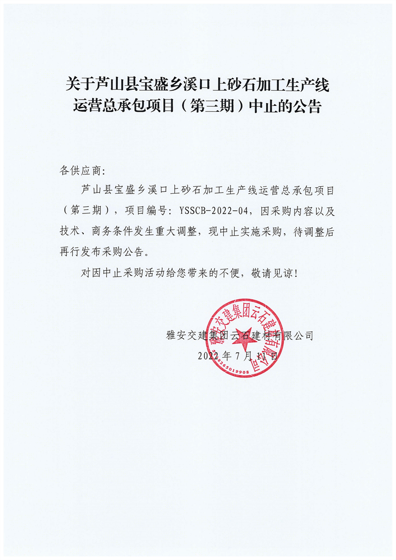 雅安交建集團(tuán)云石建材有限公司關(guān)于蘆山縣寶盛鄉(xiāng)溪口上砂石加工生產(chǎn)線運(yùn)營(yíng)總承包項(xiàng)目(第三期)中止的公告