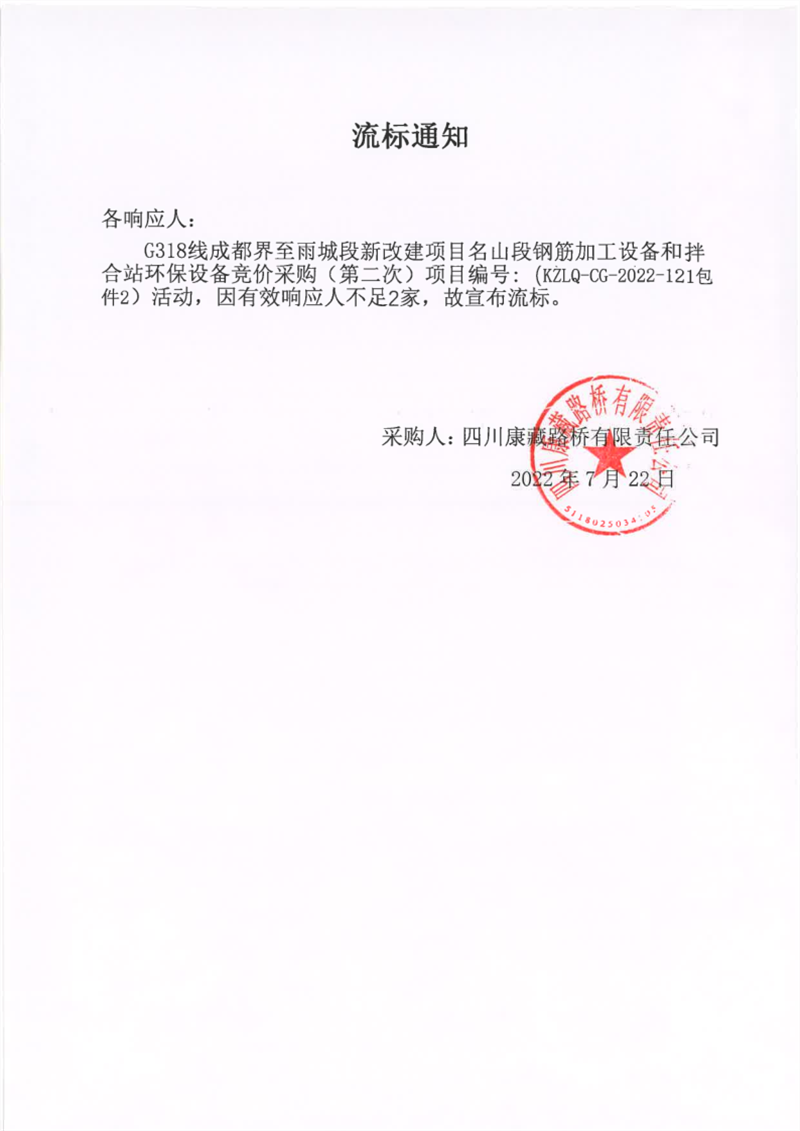 四川康藏路橋有限責(zé)任公司G318線成都界至雨城段新改建項(xiàng)目名山段鋼筋加工設(shè)備和拌合站環(huán)保設(shè)備競價(jià)采購(第二次)包件2流標(biāo)通知