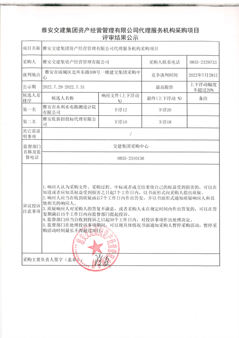 雅安交建集團(tuán)資產(chǎn)經(jīng)營管理有限公司代理服務(wù)機(jī)構(gòu)采購項(xiàng)目評審結(jié)果公示