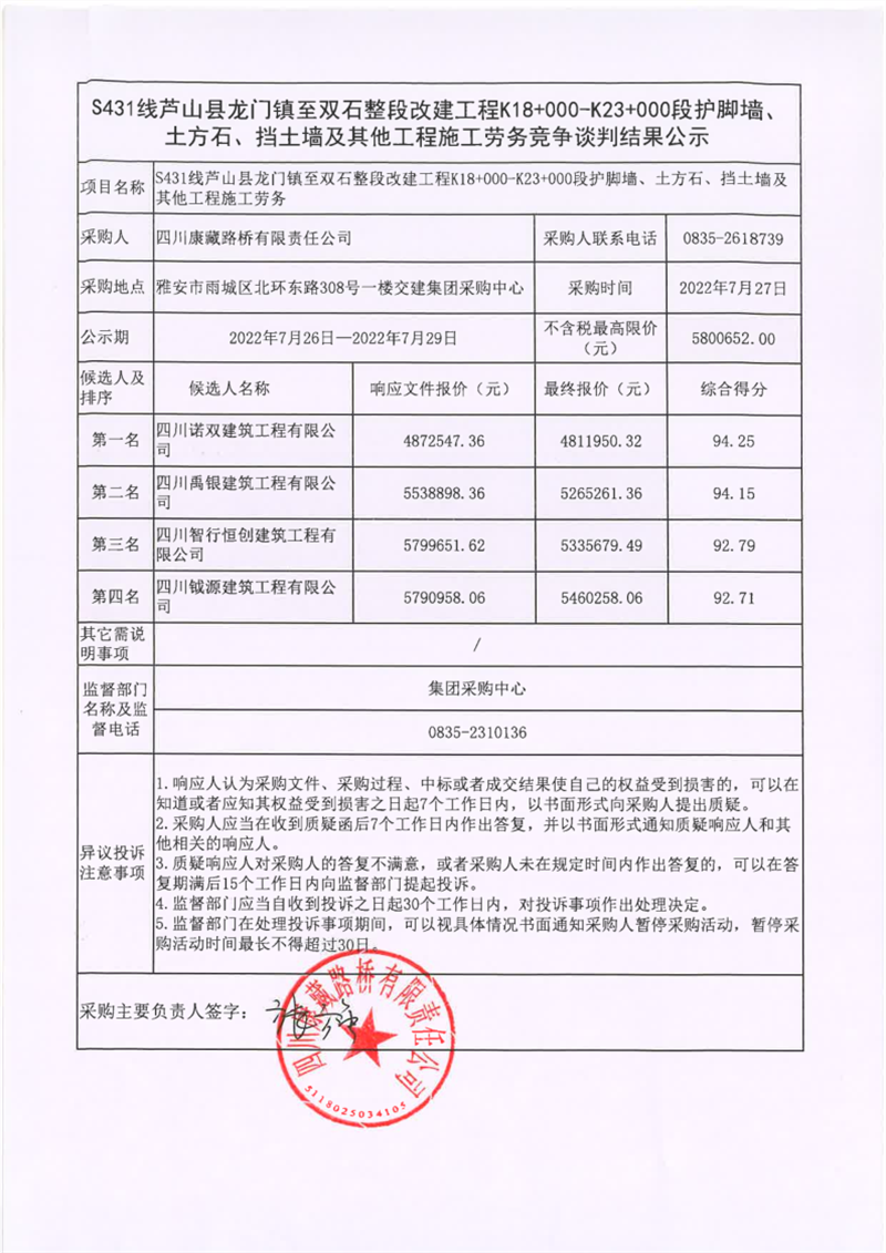 四川康藏路橋有限責(zé)任公司S431線蘆山縣龍門鎮(zhèn)至雙石整段改建工程K18+000-K23+000段護腳墻、土方石、擋土墻及其他工程施工勞務(wù)競爭談判結(jié)果公示