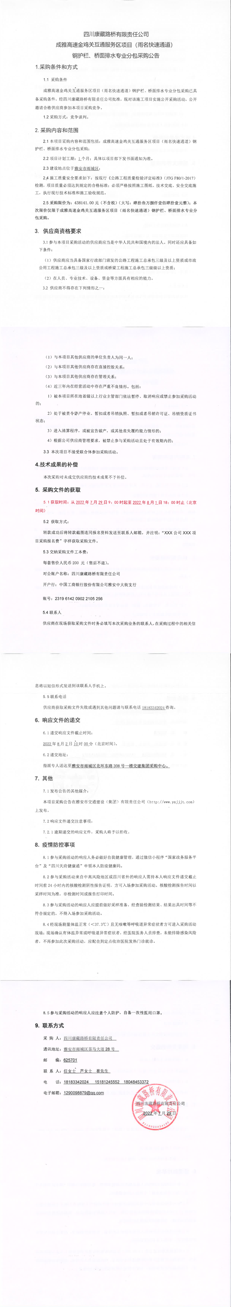 四川康藏路橋有限責(zé)任公司成雅高速金雞關(guān)互通服務(wù)區(qū)項(xiàng)目(雨名快速通道)鋼護(hù)欄、橋面攔水專業(yè)分包采購公告
