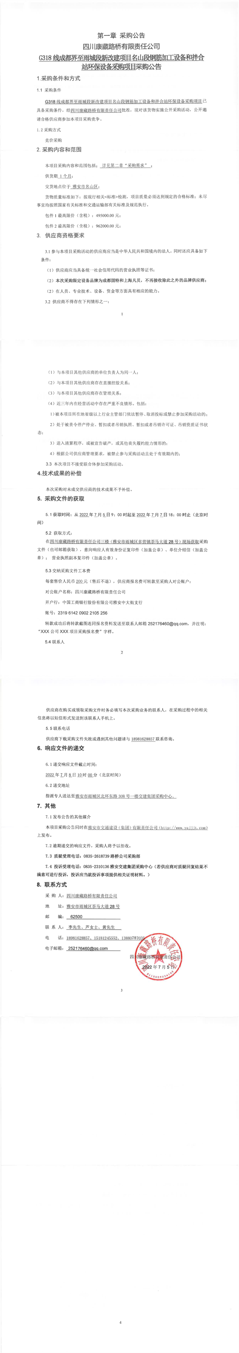 四川康藏路橋有限責任公司G318線成都界至雨城段新改建項目名山段鋼筋加工設備和拌合站環(huán)保設備采購項目采購公告
