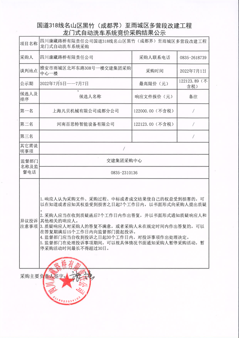 四川康藏路橋有限責任公司國道318名山區(qū)黑竹(成都界)至雨城區(qū)多營段改建工程龍門式自動洗車系統(tǒng)競價采購結(jié)果公示