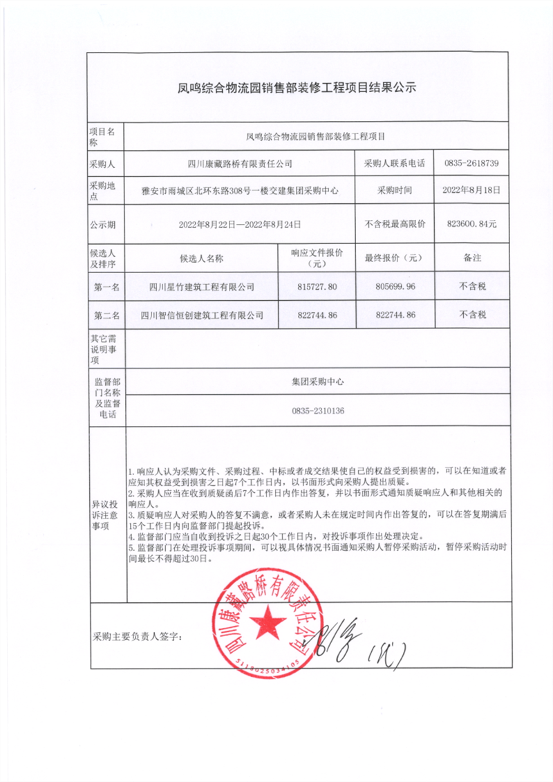 四川康藏路橋有限責任公司鳳鳴綜合物流園銷售部裝修工程項目結果公示