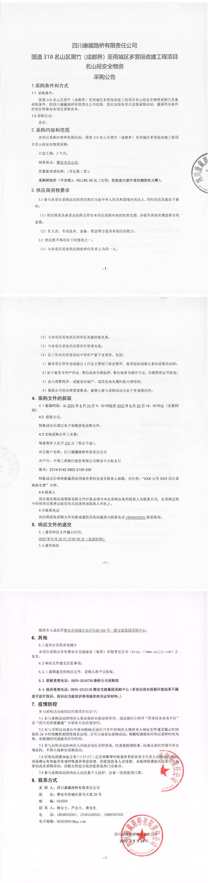 四川康藏路橋有限責(zé)任公司國(guó)道318名山區(qū)黑竹(成都界)至雨城區(qū)多營(yíng)段改建工程項(xiàng)目名山段安全物資采購(gòu)公告