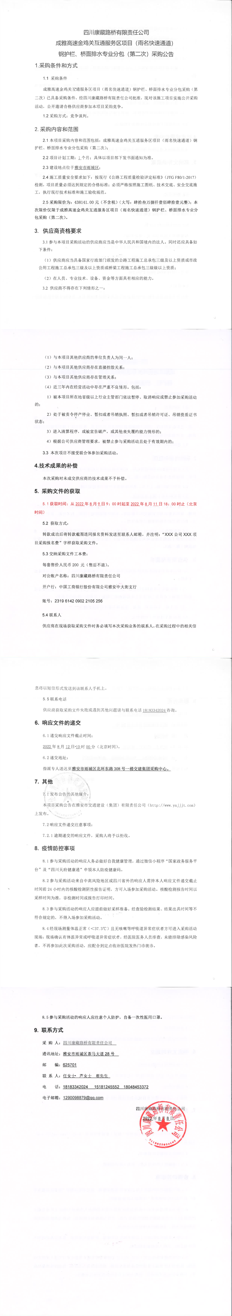 四川康藏路橋有限責(zé)任公司成雅高速金雞關(guān)互通服務(wù)區(qū)項(xiàng)目(雨名快速通道)鋼護(hù)欄、橋面排水工程專業(yè)分包(第二次)采購(gòu)公告