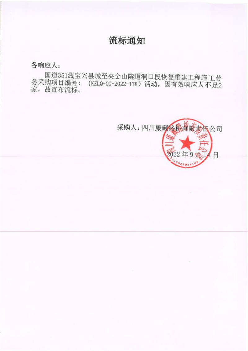 四川康藏路橋有限責任公司國道351線寶興縣城至夾金山隧道洞口段恢復重建工程施工勞務采購流標通知