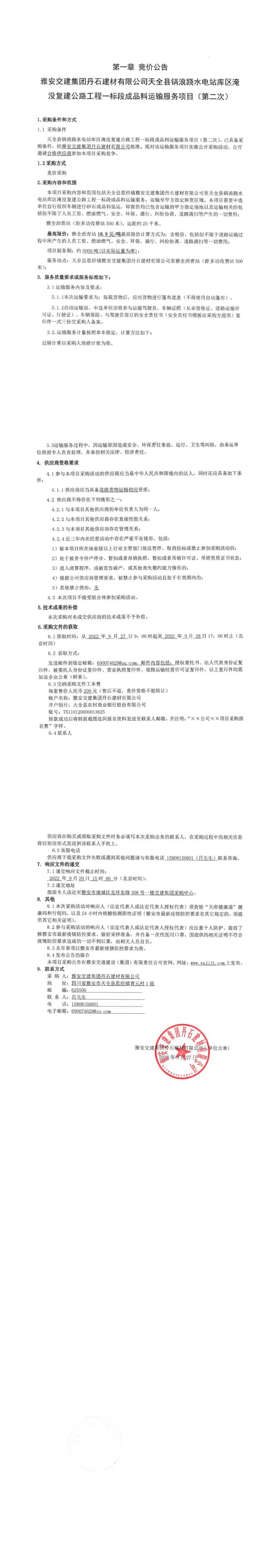 雅安交建集團丹石建材有限公司天全縣鍋浪蹺水電站庫區(qū)淹沒復(fù)建公路工程一標段成品料運輸服務(wù)項目(第二次)競價公告