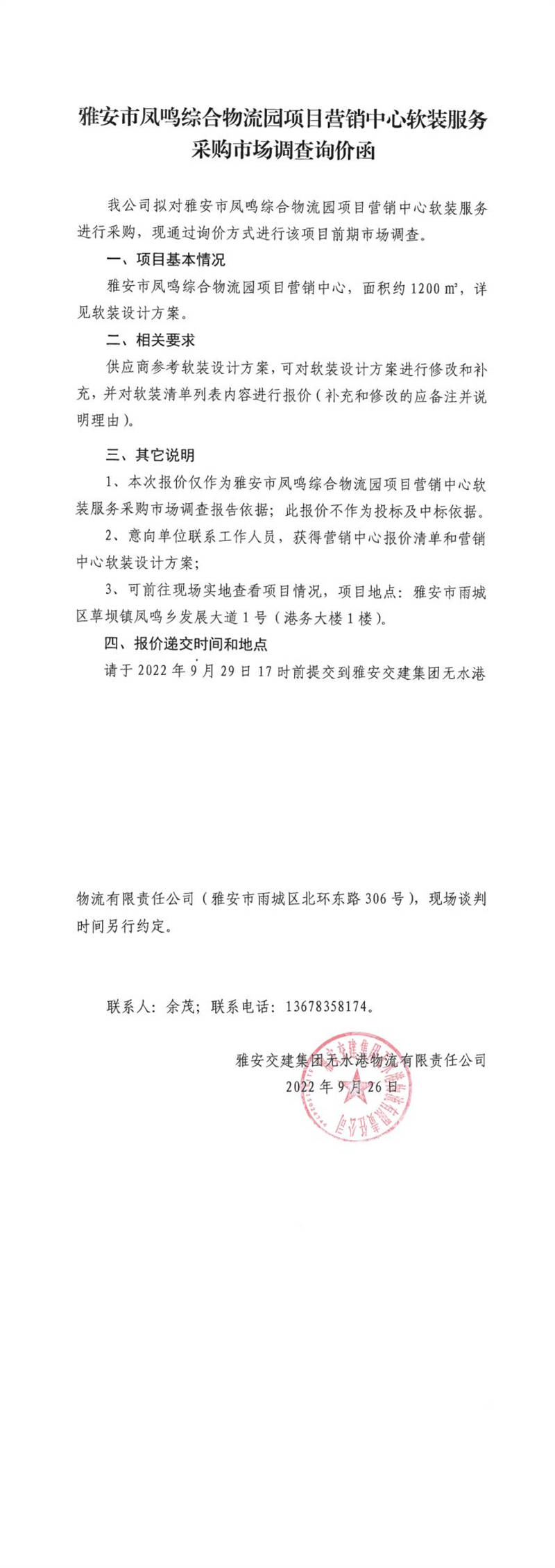 雅安交建集團無水港物流有限責任公司雅安市鳳鳴綜合物流園項目營銷中心軟裝服務(wù)采購市場調(diào)查詢價函