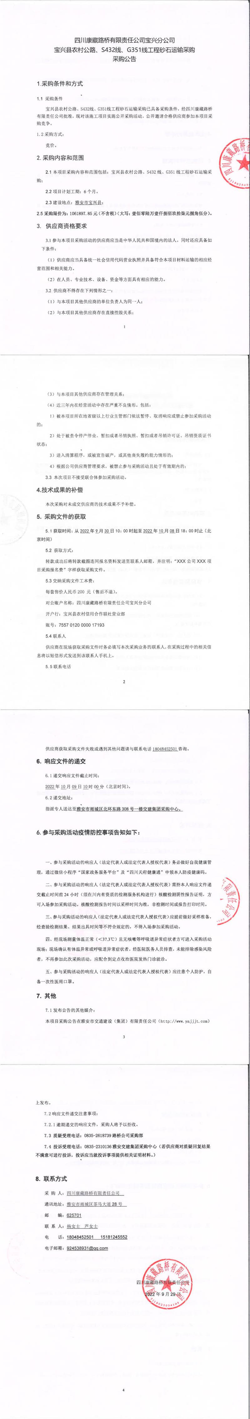 四川康藏路橋有限責(zé)任公司寶興分公司寶興縣農(nóng)村公路、S432線、G351線工程砂石運(yùn)輸采購(gòu)采購(gòu)公告