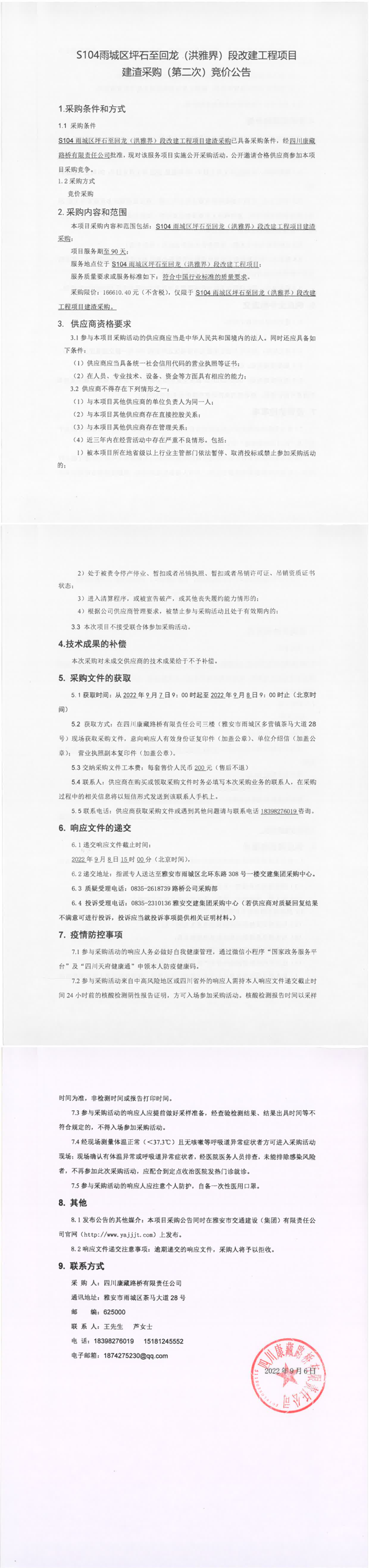四川康藏路橋有限責(zé)任公司S104雨城區(qū)坪石至回龍(洪雅界)段改建工程項(xiàng)目建渣采購(gòu)(第二次)競(jìng)價(jià)公告