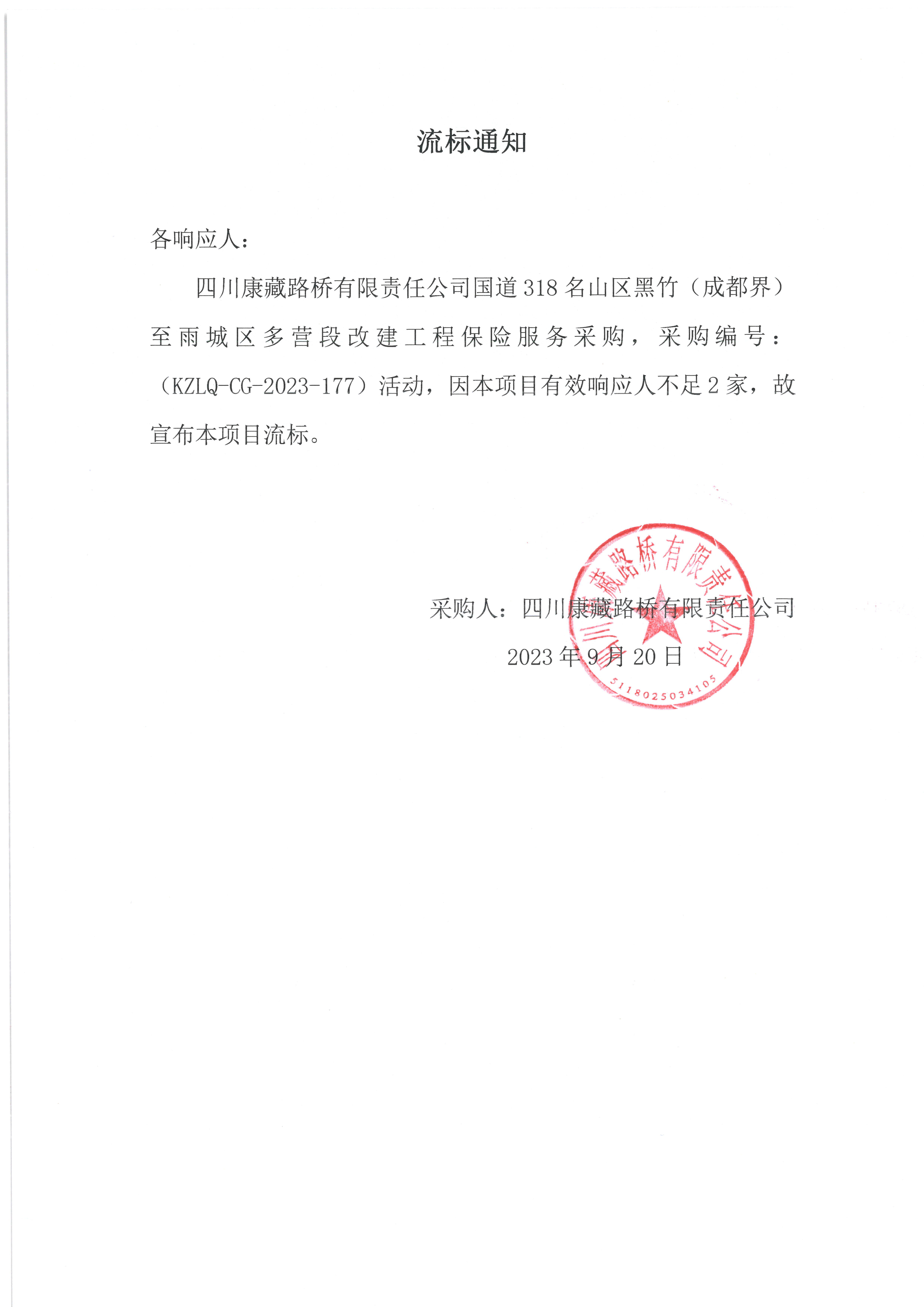 四川康藏路橋有限責任公司國道318名山區(qū)黑竹(成都界)至雨城區(qū)多營段改建工程保險服務(wù)采購流標通知