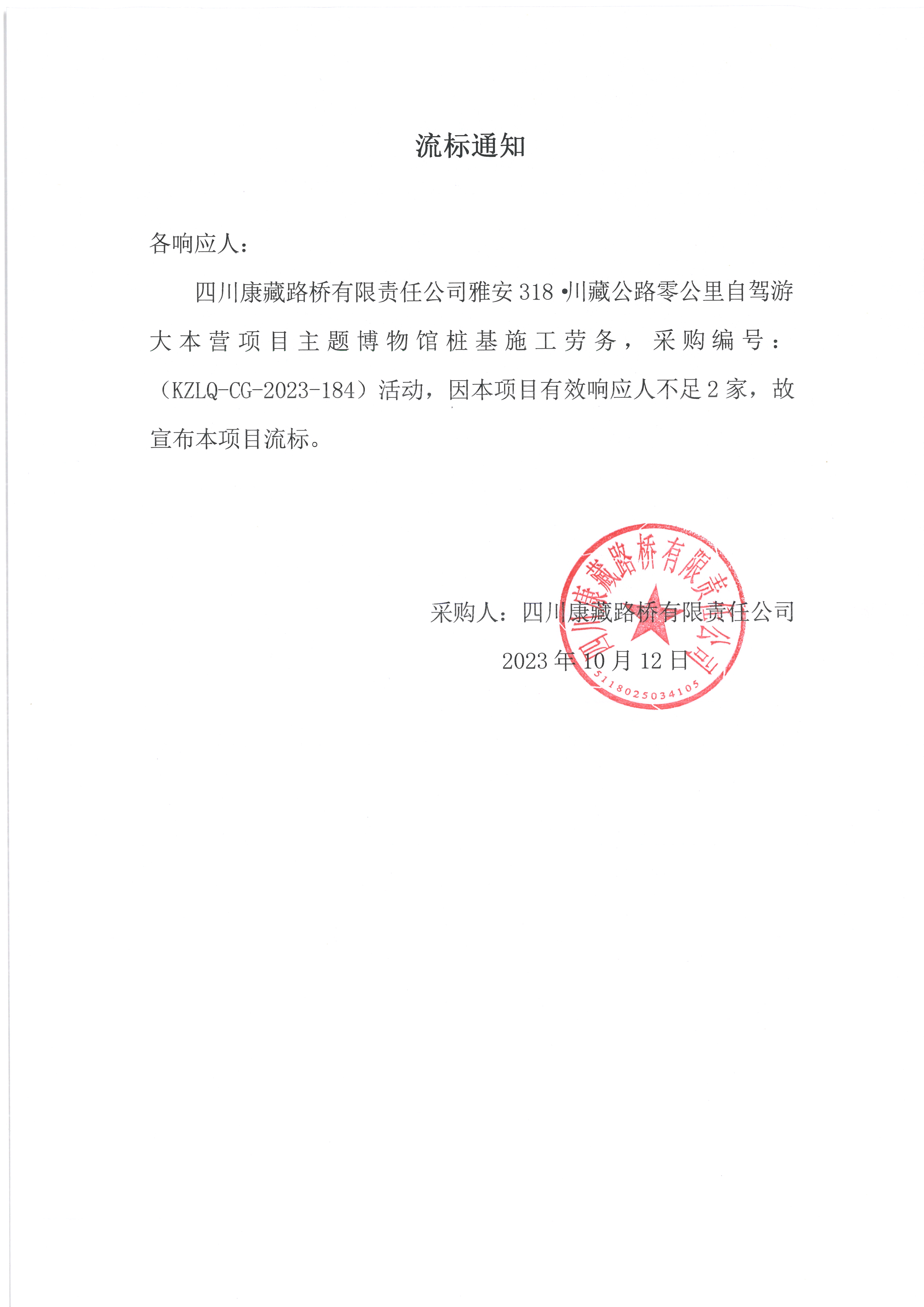 四川康藏路橋有限責(zé)任公司雅安318·川藏公路零公里自駕游大本營項目主題博物館樁基施工勞務(wù)流標(biāo)通知