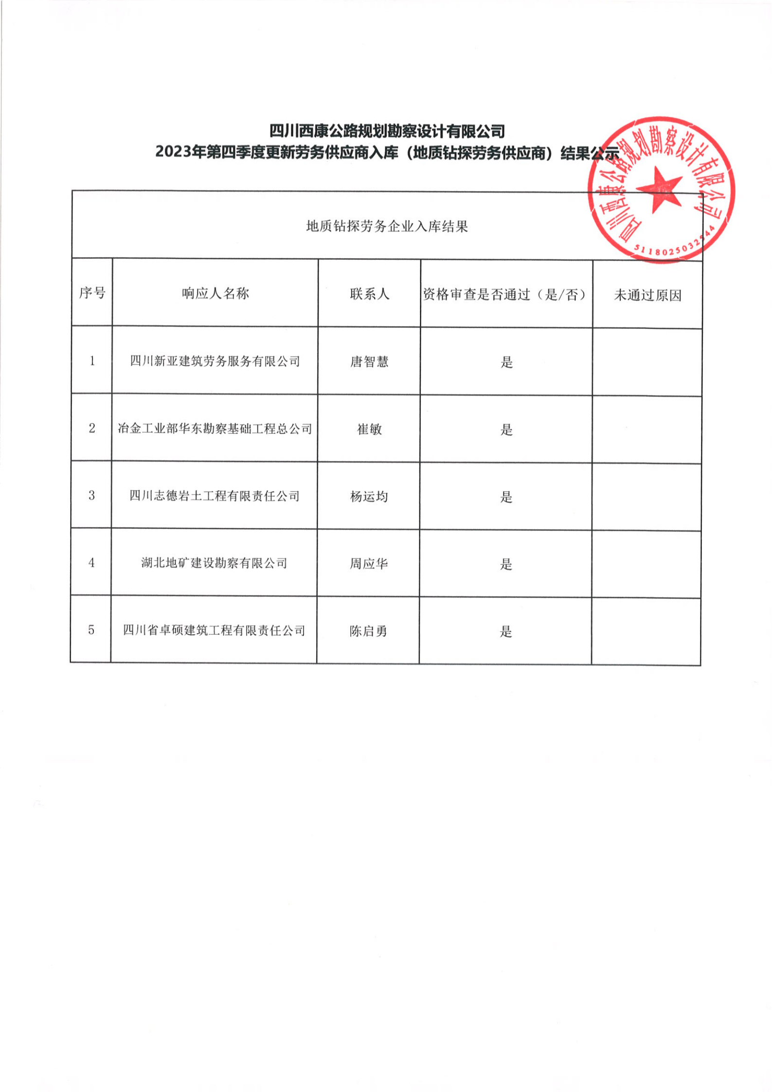 四川西康公路規(guī)劃勘察設計有限公司2023年第四季度更新勞務供應商入庫(地質鉆探勞務供應商)結果公示