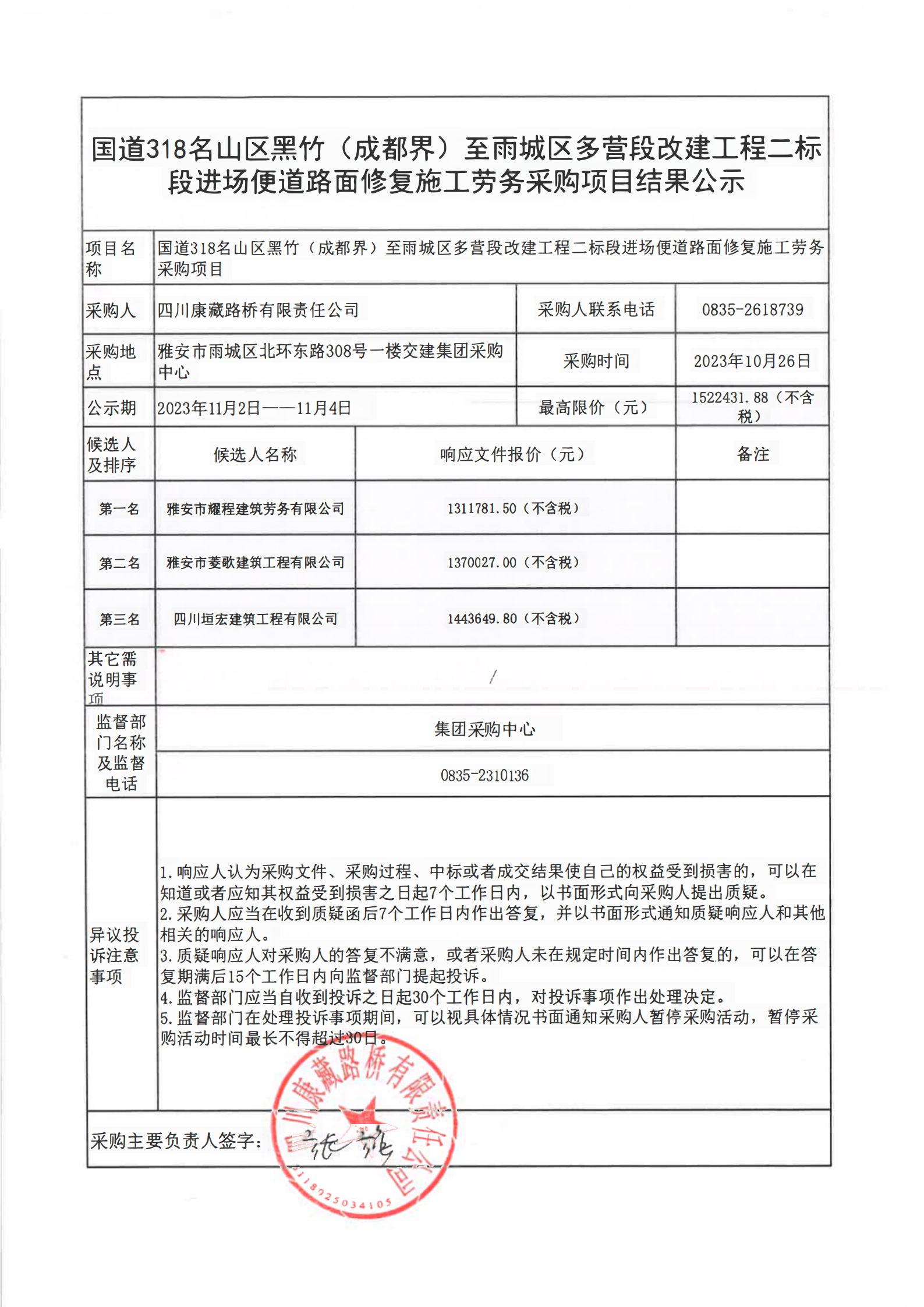 四川康藏路橋有限責(zé)任公司國道318名山區(qū)黑竹(成都界)至雨城區(qū)多營段改建工程二標(biāo)段進(jìn)場便道路面修復(fù)施工勞務(wù)采購項(xiàng)目結(jié)果公示