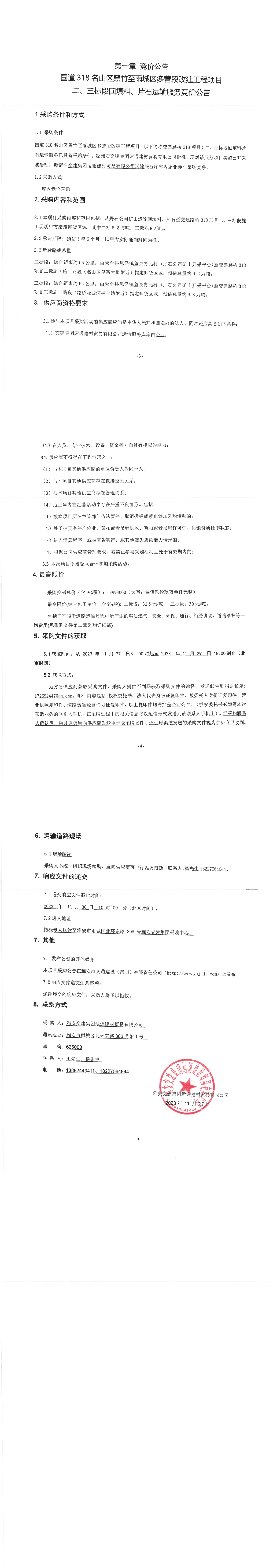 交建集團(tuán)運(yùn)通建材貿(mào)易有限公司國道318名山區(qū)黑竹至雨城區(qū)多營段改建工程項目二、三標(biāo)段回填料、片石運(yùn)輸服務(wù)競價公告