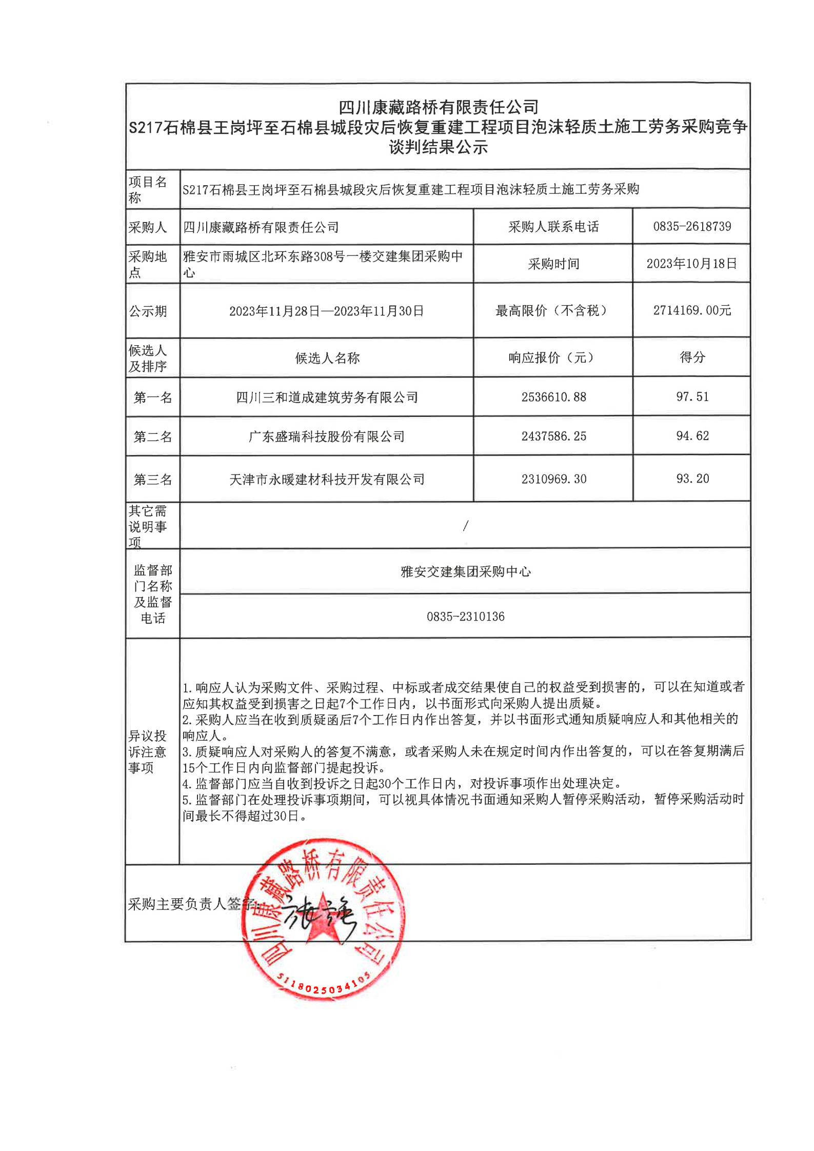 四川康藏路橋有限責(zé)任公司S217石棉縣王崗坪至石棉縣城段災(zāi)后恢復(fù)重建工程項(xiàng)目泡沫輕質(zhì)土施工勞務(wù)采購結(jié)果公示