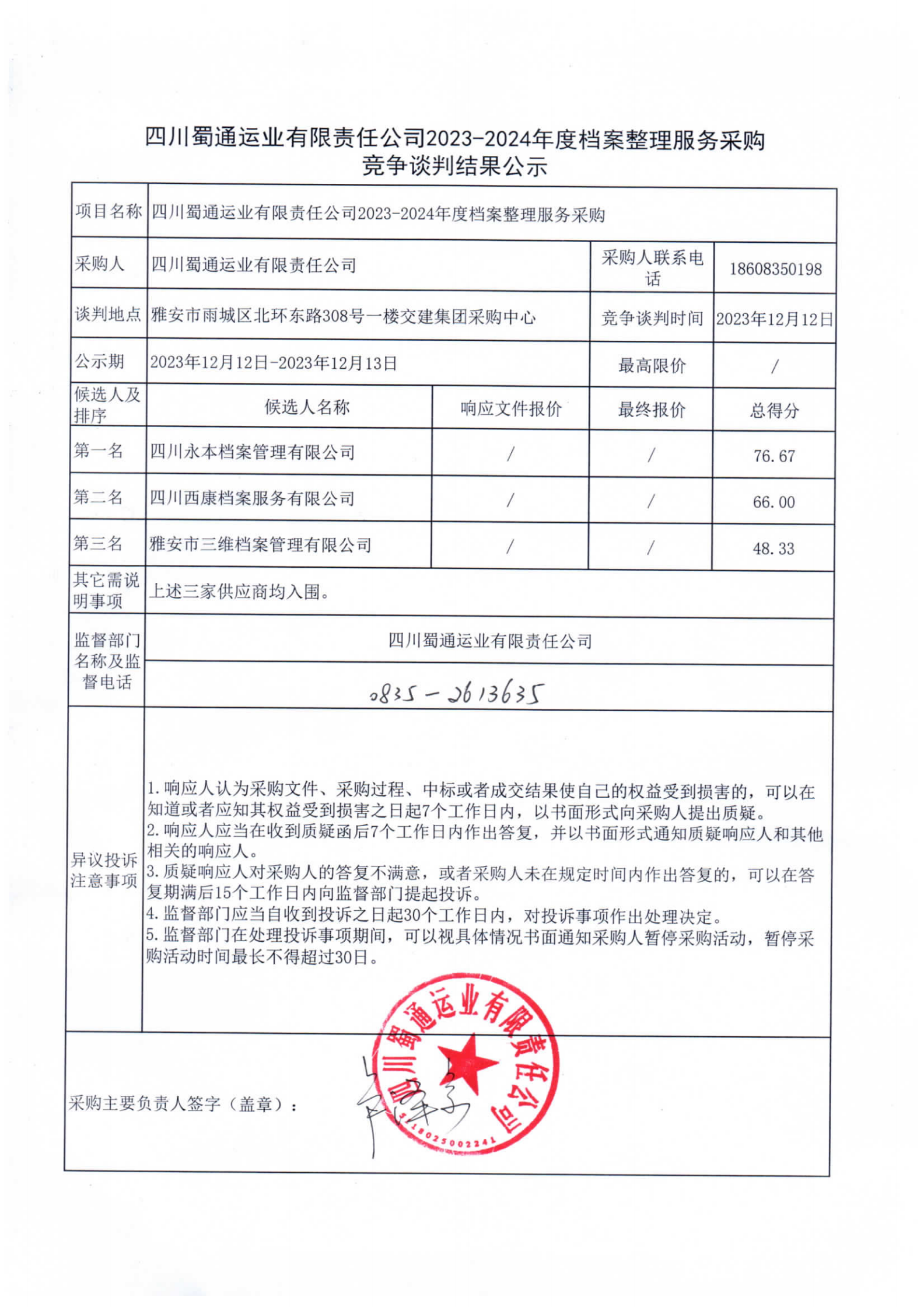 四川蜀通運業(yè)有限責(zé)任公司2023-2024年度檔案整理服務(wù)采購競爭談判結(jié)果公示