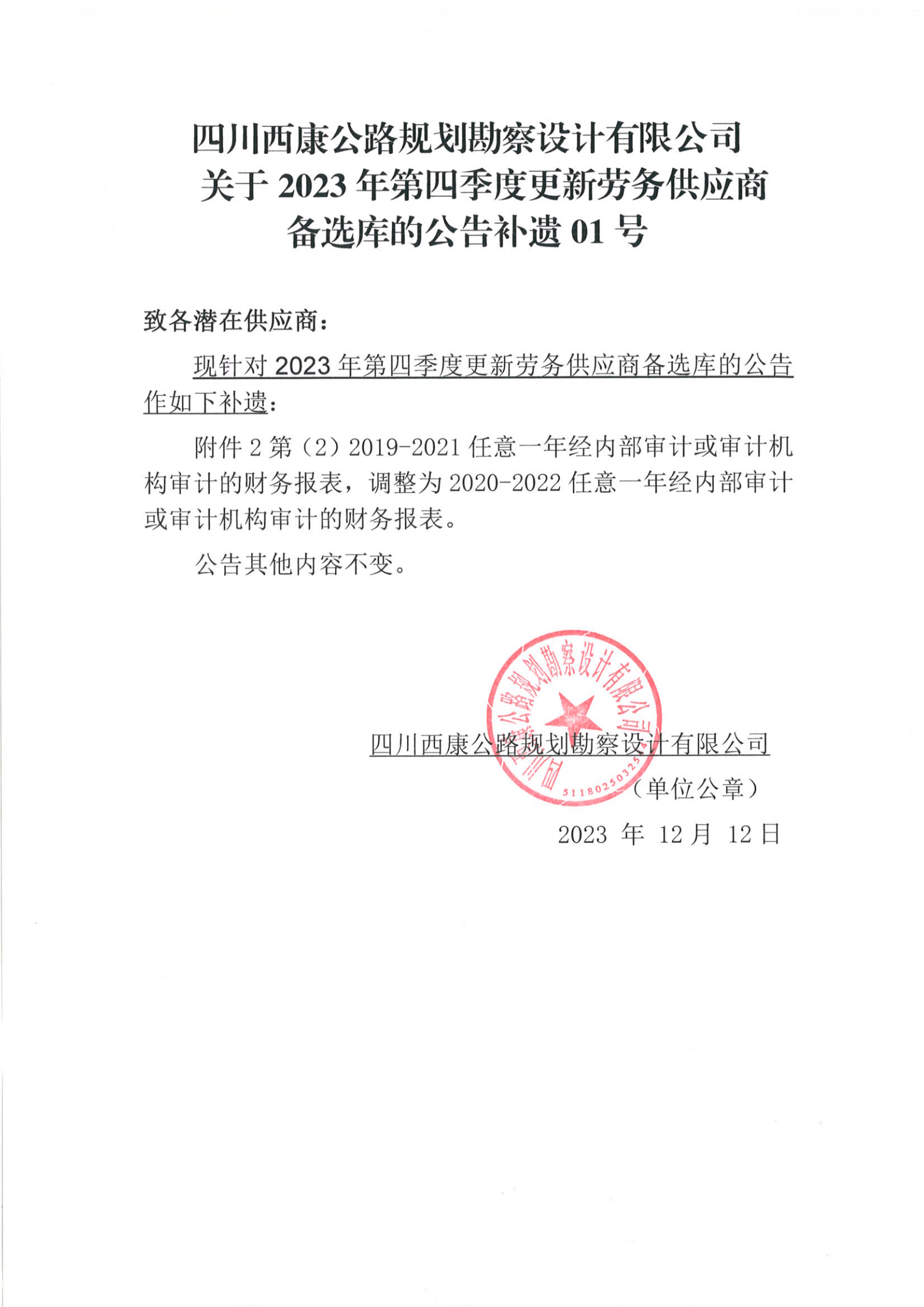 四川西康公路規(guī)劃勘察設(shè)計有限公司關(guān)于2023年第四季度更新勞務(wù)供應商備選庫的公告補遺01號