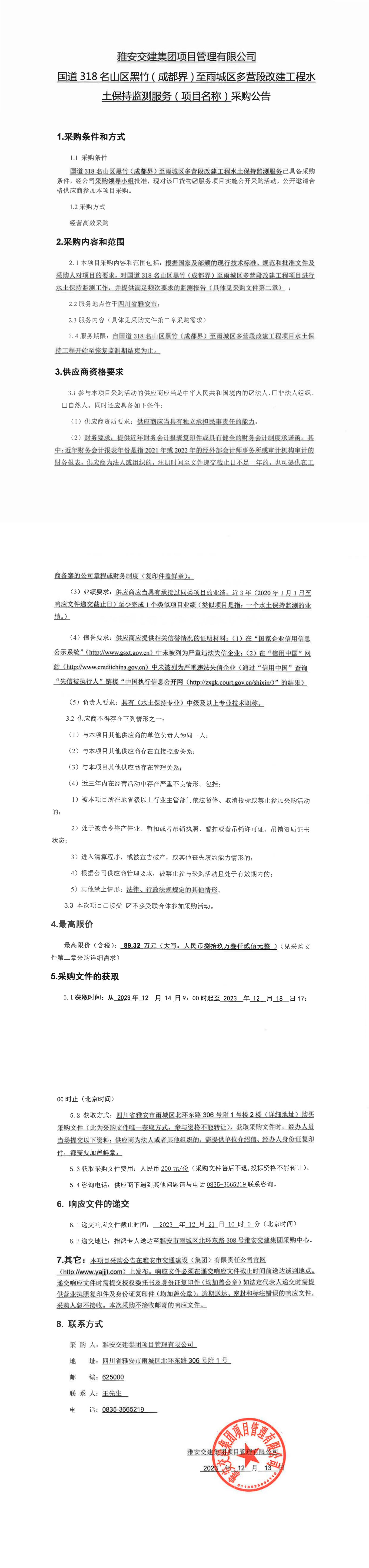 雅安交建集團(tuán)項(xiàng)目管理有限公司國道318名山區(qū)黑竹(成都界)至雨城區(qū)多營段改建工程水土保持監(jiān)測(cè)服務(wù)(項(xiàng)目名稱)采購公告