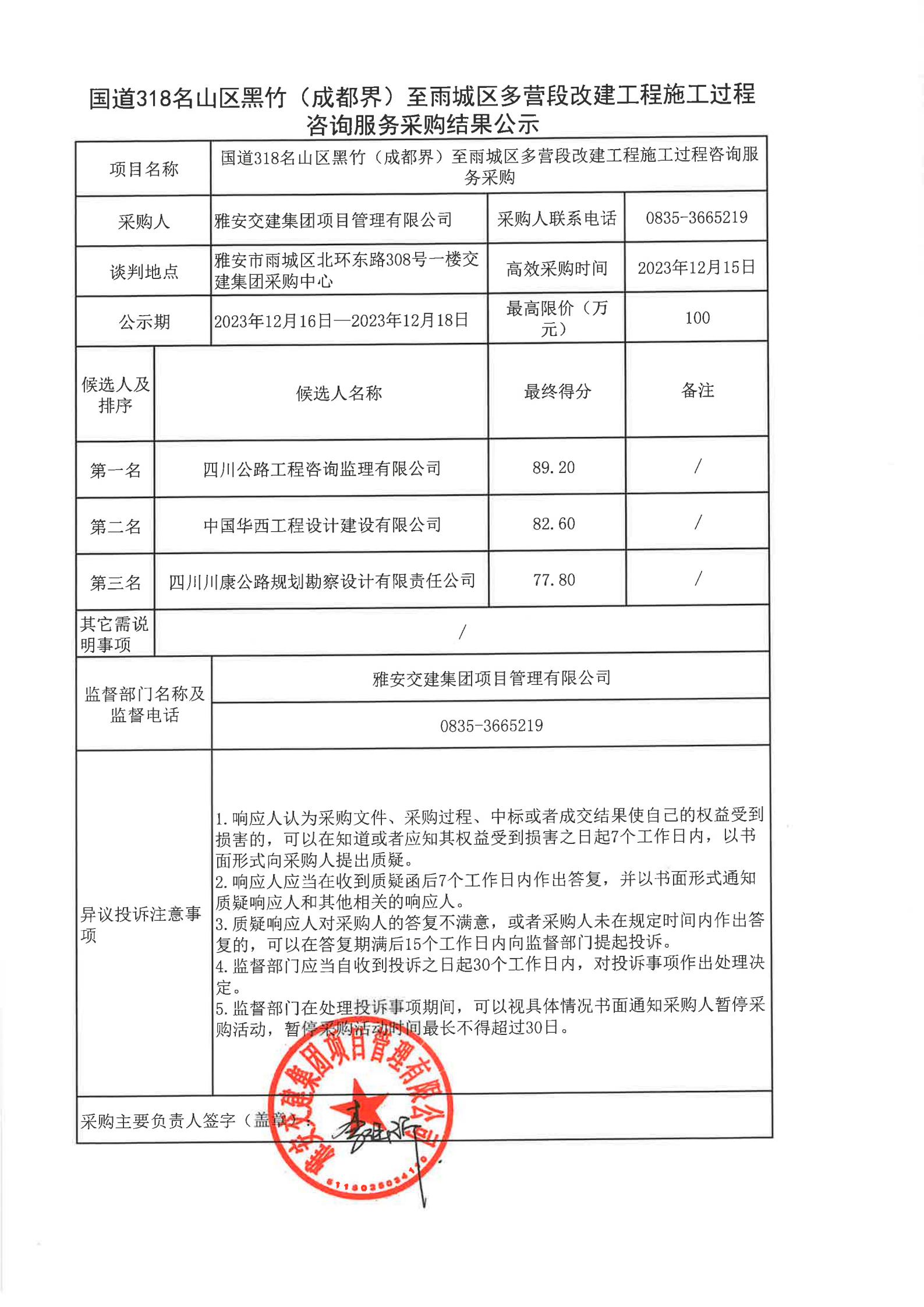 雅安交建集團(tuán)項目管理有限公司國道318名山區(qū)黑竹(成都界)至雨城區(qū)多營段改建工程施工過程咨詢服務(wù)采購結(jié)果公示