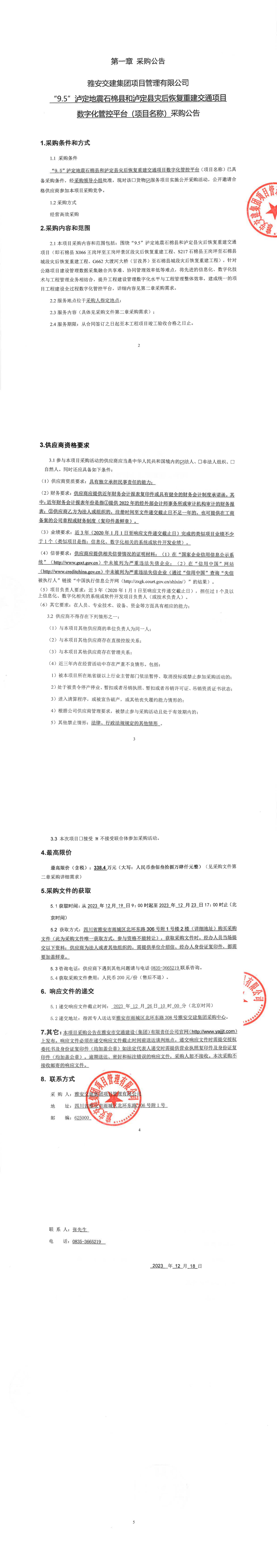 雅安交建集團(tuán)項(xiàng)目管理有限公司“9.5”瀘定地震石棉縣和瀘定縣災(zāi)后恢復(fù)重建交通項(xiàng)目數(shù)字化管控平臺(tái)(項(xiàng)目名稱)采購(gòu)公告