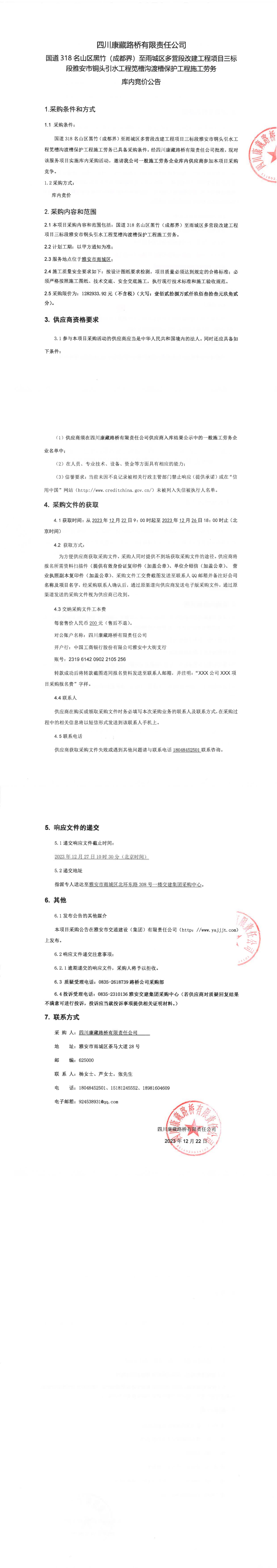 四川康藏路橋有限責(zé)任公司國道318名山區(qū)黑竹(成都界)至雨城區(qū)多營段改建工程項目三標(biāo)段雅安市銅頭引水工程筧槽溝渡槽保護(hù)工程施工勞務(wù)庫內(nèi)競價公告