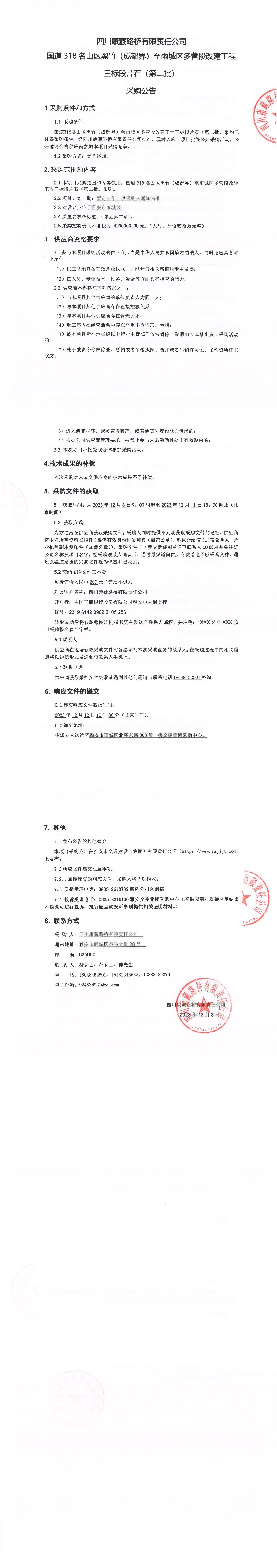 四川康藏路橋有限責(zé)任公司國道318名山區(qū)黑竹(成都界)至雨城區(qū)多營段改建工程三標(biāo)段片石(第二批)采購公告